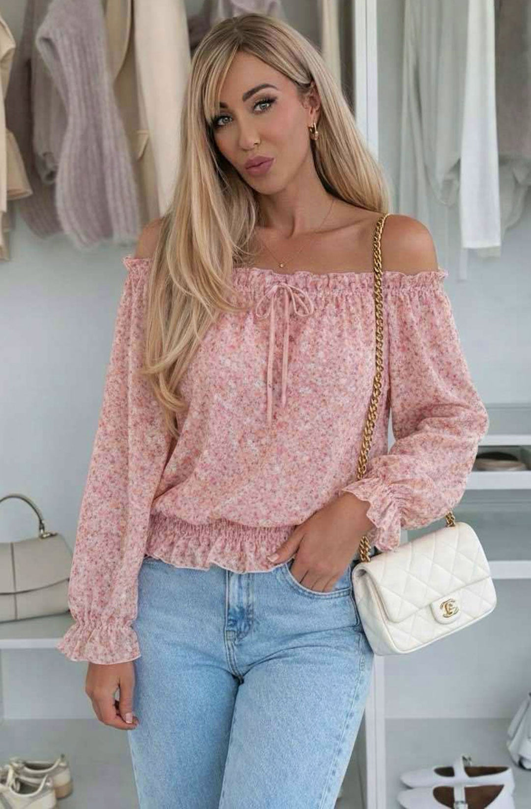Eloise Floral Bardot Frill Shirred Waist Shirt Blouse Top-Pink