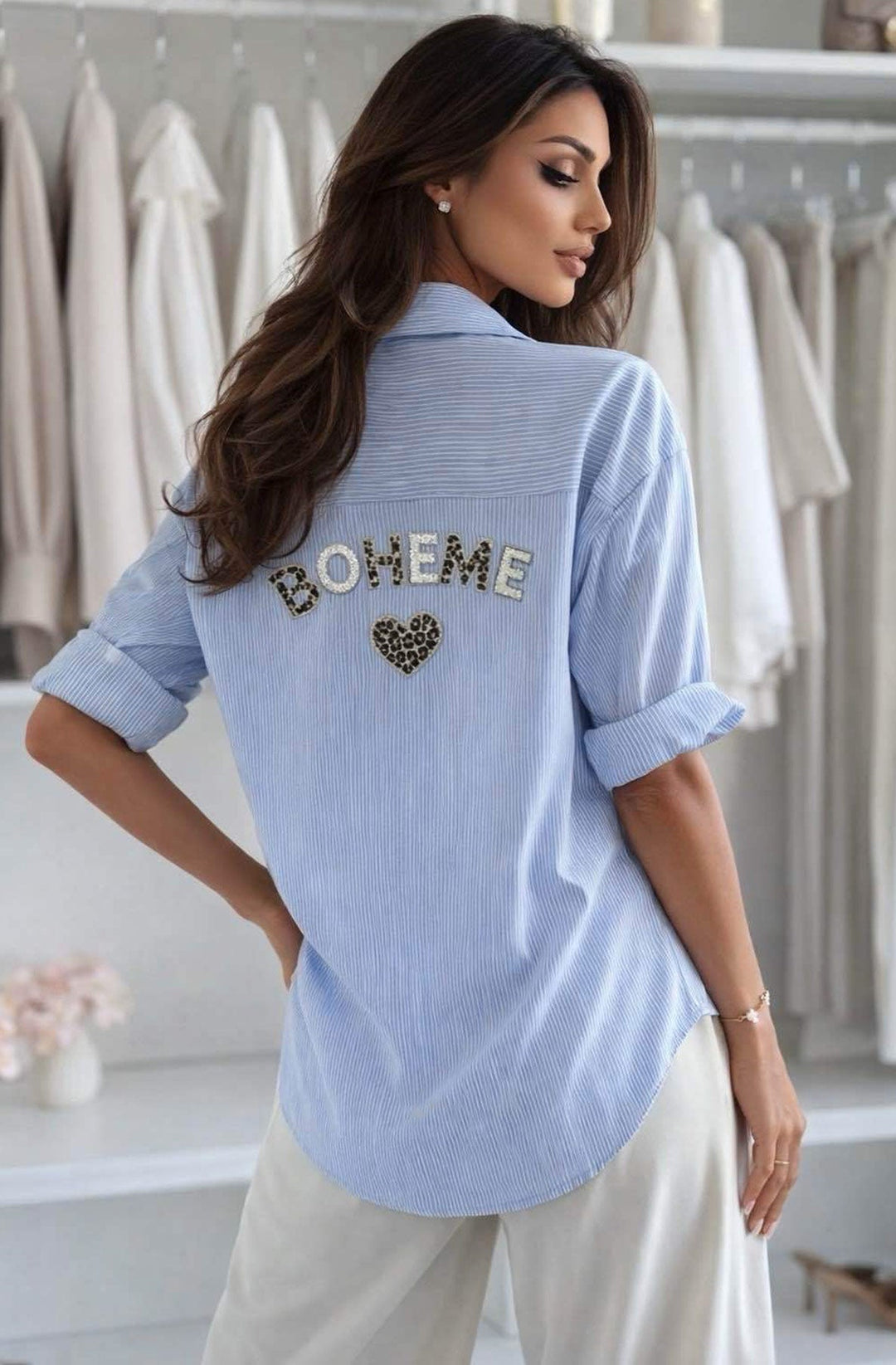 'BOHEME' Embellished Oversized Stripe Shirt Top-Blue