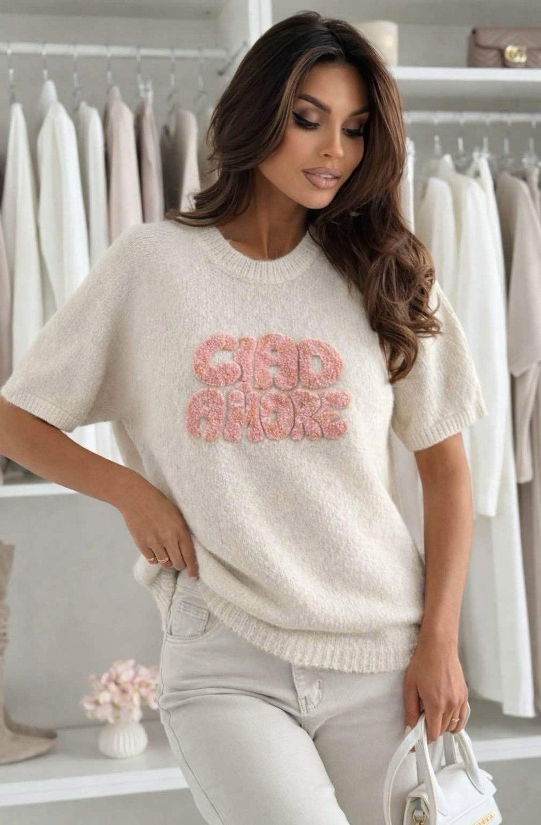 'Ciao Amore' Short Sleeve Alpaca Blend Lightweight Knitted Sweater Top-Ivory