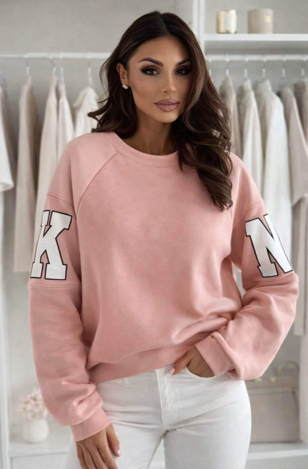 Amber ‘RKNE’ Oversized Raglan Letter Sleeve Sweatshirt Top-Pink