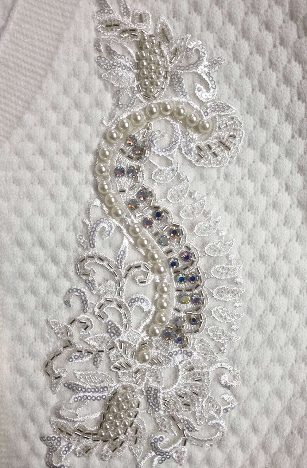 The front is elevated with paisley embroidery, hand-applied pearls & sequins, and finished with delicate lace appliqué 🌸💎 – giving the knit a romantic, festive glow.
