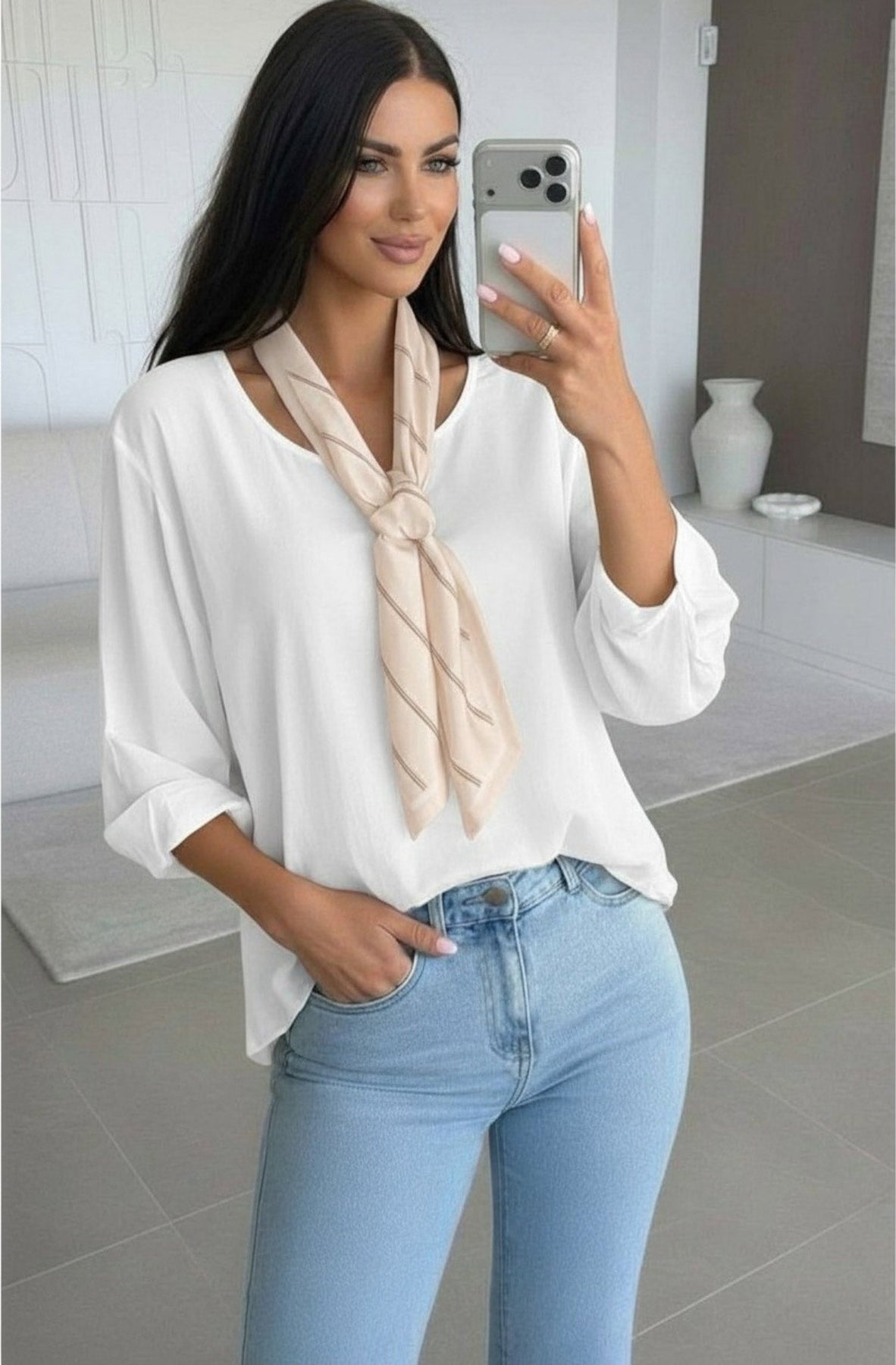 Featuring a classic crew neckline and a removable matching scarf included as part of the set 🧣, this blouse allows for multiple styling options — wear the scarf tied at the neck, loosely draped, or remove it entirely for a clean, minimal look.