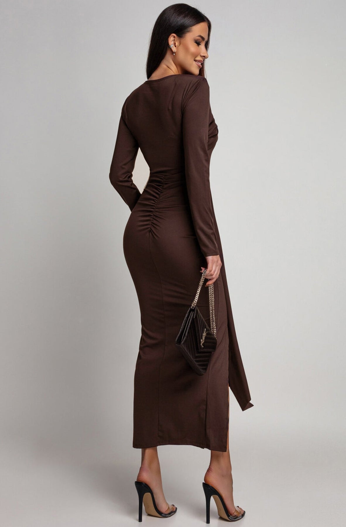 Dolly Draped Ruffle Front Midaxi Dress-Brown