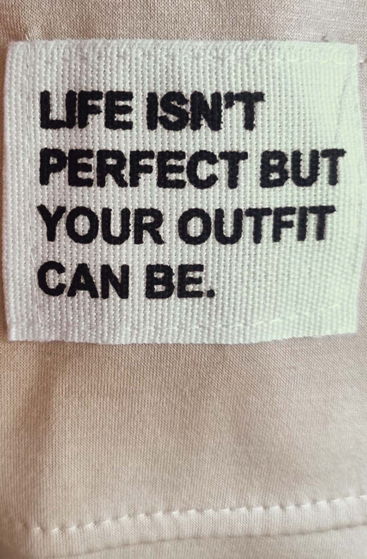 💬 “Life isn’t perfect, but your outfit can be” – graphic printed detail on one sleeve.