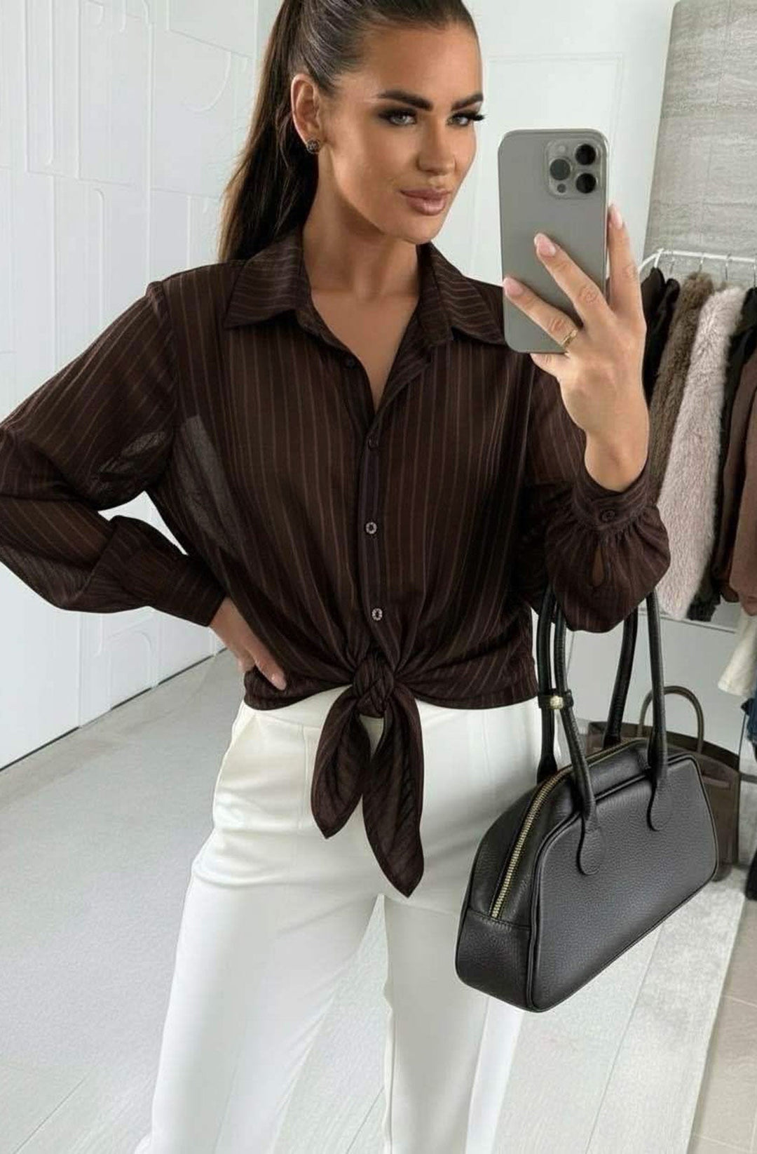Elie Tie Front Stripe Shirt Top-Brown